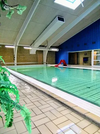 I svømmehallen har vi vores opvarmede bassin, der altid er ca. 33 grader varmt. Vanddybden er 65 cm i den lave ende og 80 cm i den dybe ende.